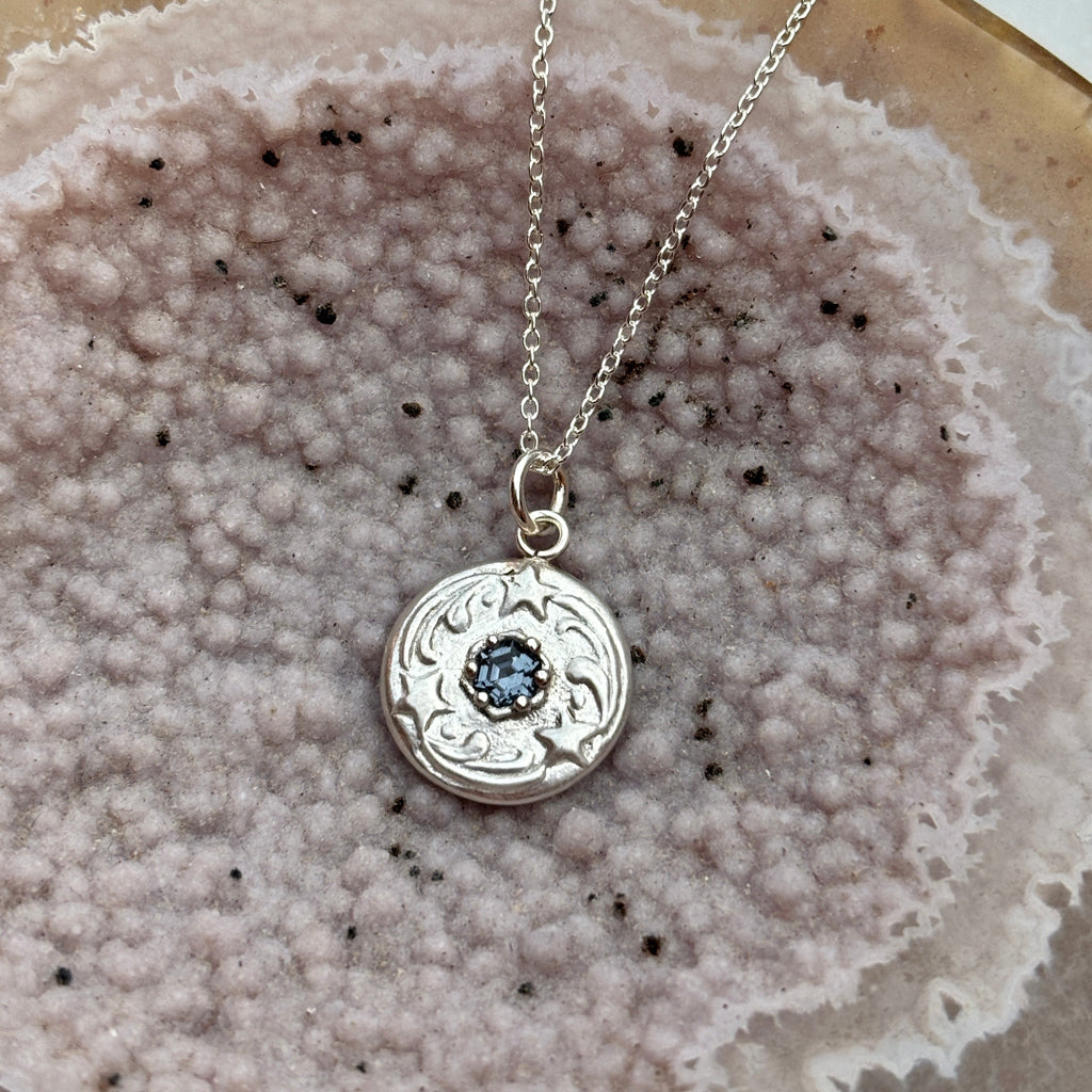 Three shooting stars surround a dreamy hexagonal spinel; a stone beneficial for grounding and anchoring you on your path. *Note the spinel in the gold pendant is a denim blue while the stone in the silver pendant is periwinkle.